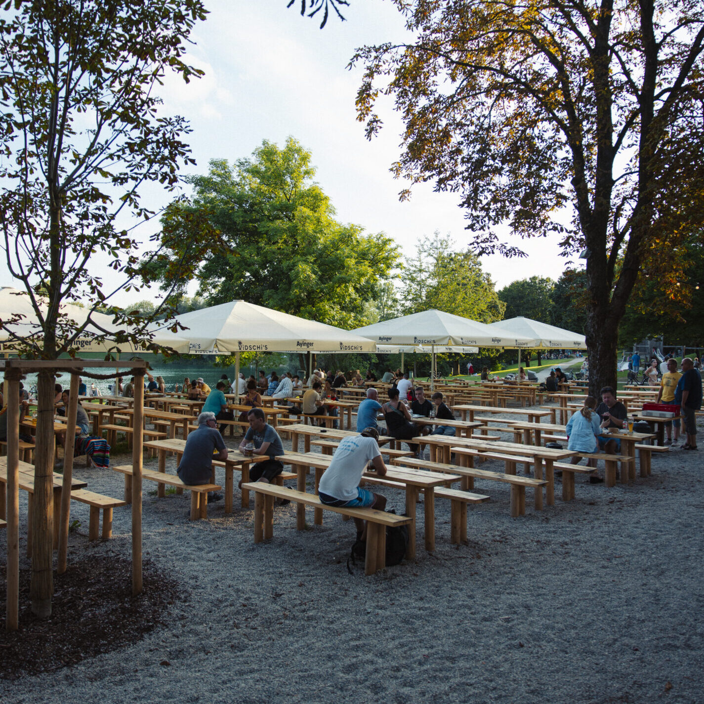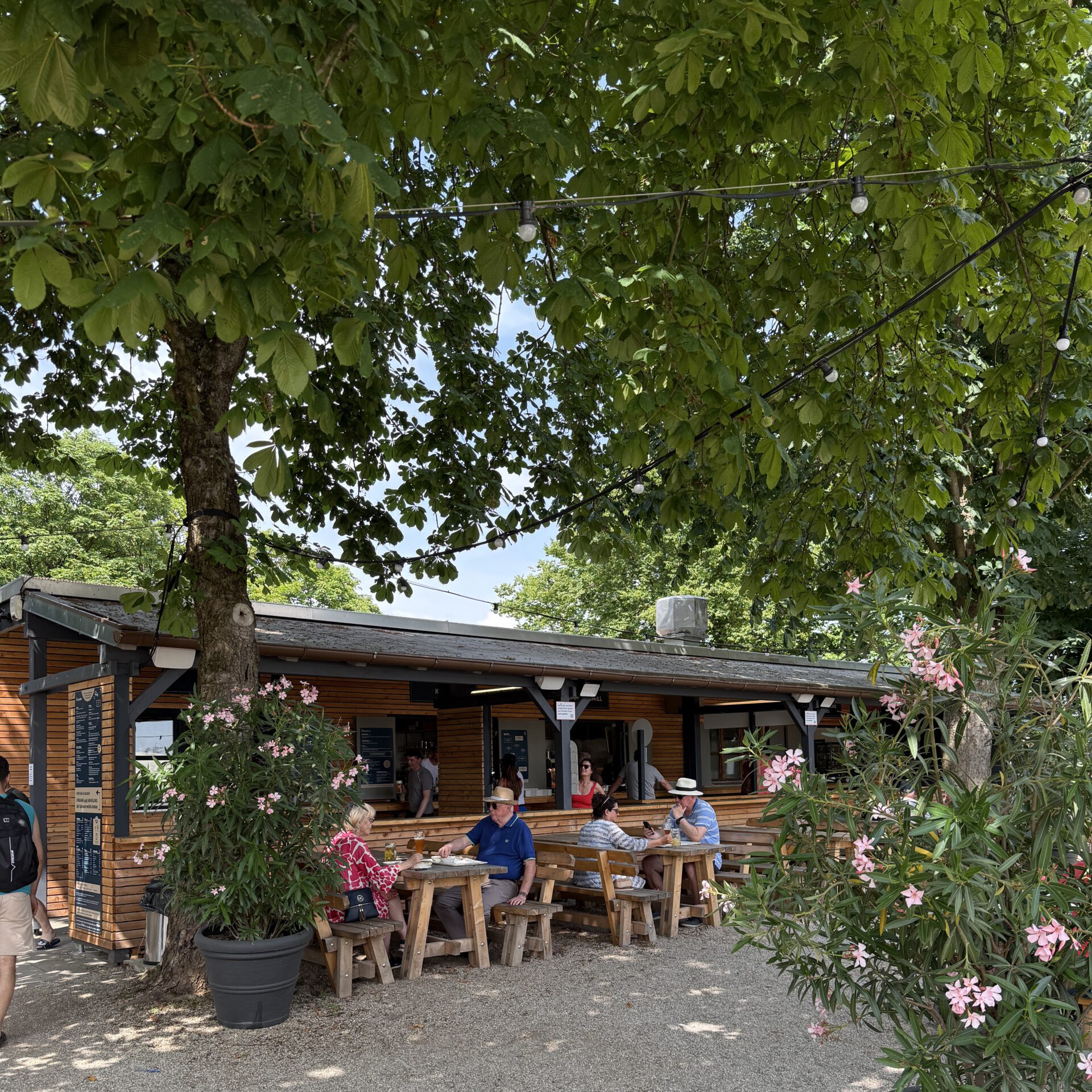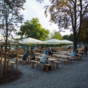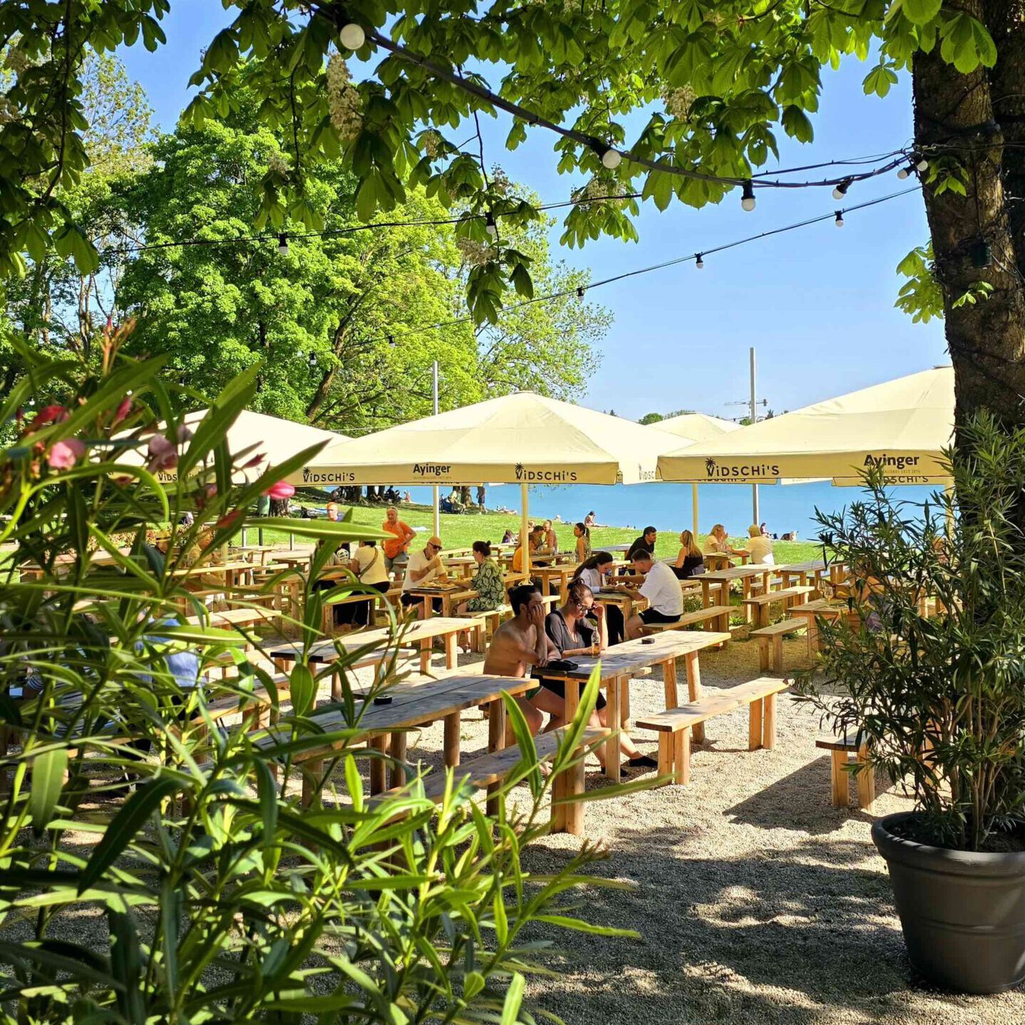 Unter den alten Kastanien und großen Schirmen findet sich immer ein schattiges Plätzchen mit Traumblick aufs Wasser.